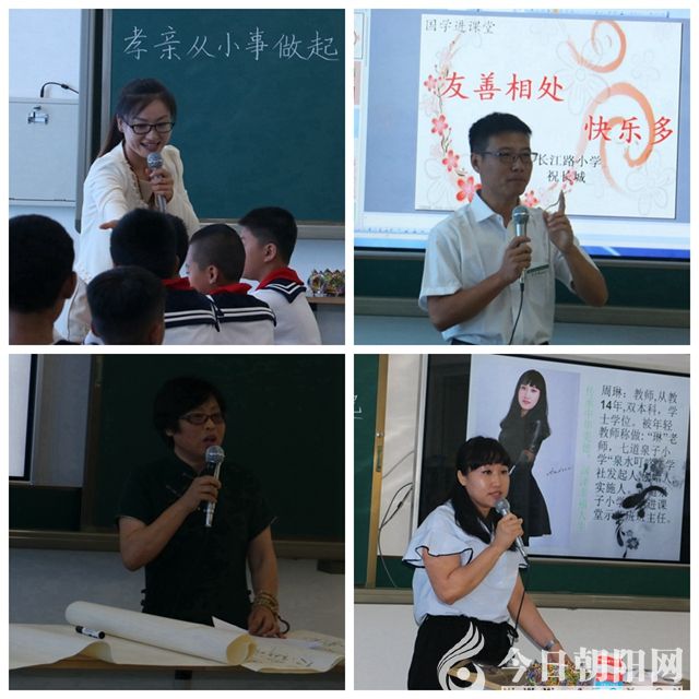 長江路小學(xué)祝長城老師根據(jù)《六尺巷》的故事做了體驗式德育活動課《友善相處快樂多》,聯(lián)合小學(xué)張立杰老師根據(jù)訓(xùn)蒙文《弟子規(guī)》做了體驗式德育活動課《孝親從小事做起》,西大營子鎮(zhèn)中心校德育副校長溫靜做了《品味國學(xué)經(jīng)典 增長人生智慧》的經(jīng)驗介紹,七道泉子小學(xué)周琳老師做了《傳承中華美德 潤澤幸福人生》經(jīng)驗分享。