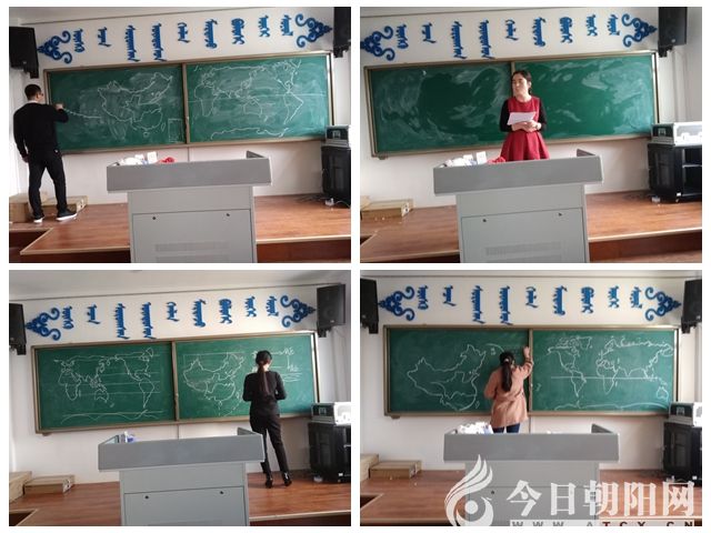 板圖板畫的比賽環(huán)節(jié),要求在不使用輔助工具的情況下,在黑板上用粉筆進(jìn)行繪圖。板圖項(xiàng)目的內(nèi)容是繪制中國輪廓圖、世界輪廓圖;板畫項(xiàng)目的內(nèi)容是抽簽決定板畫主題。板畫主題涉及高中地理教學(xué)中重要的景觀圖、原理圖、模式圖、剖面圖、聯(lián)系圖等。大部分選手動作熟練、技藝高超,在規(guī)定時(shí)間內(nèi)完成任務(wù)。所畫中國地圖和世界地圖輪廓準(zhǔn)確、清晰、完整;圖幅大小適度、設(shè)計(jì)合理;長江、黃河仿形逼真、位置準(zhǔn)確;首都北京圖例科學(xué)、位置正確。所畫板畫具有科學(xué)性、地理性、典型性、藝術(shù)性。