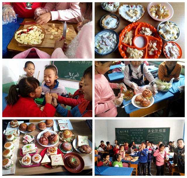 我與學(xué)生共同準(zhǔn)備課堂上所需要的材料,認(rèn)真傾聽(tīng)學(xué)生的設(shè)計(jì)方案,充分尊重學(xué)生的主體地位,鼓勵(lì)他們自主探究,大膽創(chuàng)新,主動(dòng)實(shí)踐。學(xué)生在動(dòng)手動(dòng)腦的過(guò)程中不但學(xué)會(huì)了科學(xué)知識(shí),掌握了方法技能,培養(yǎng)了正確的情感態(tài)度價(jià)值觀,更化身為美的發(fā)現(xiàn)者、欣賞者和創(chuàng)造者。火紅的楓葉、金黃的銀杏葉、還帶著一絲綠色的柳葉……各種形狀、各種顏色的葉子,為學(xué)生們提供了大顯身手的舞臺(tái)。學(xué)生們分工合作,有的化身成設(shè)計(jì)師,負(fù)責(zé)設(shè)計(jì)精美的圖案;有的化身成裝飾師,為圖案貼上美麗的葉片;有的化身成攝影師,用老師的手機(jī)記錄下同學(xué)們一個(gè)個(gè)精彩的瞬間和一幅幅精美的葉畫。那一幅幅精美的葉畫,成為我校綜合實(shí)踐活動(dòng)室和走廊里最亮麗的風(fēng)景,《葉畫》也成為我校保留的校本教材;制作《自護(hù)小卡片》一課,學(xué)生們?cè)谝粡垙堅(jiān)O(shè)計(jì)精美的卡片上寫下了自己對(duì)自我保護(hù)知識(shí)的積累;《自制泡泡液》時(shí),學(xué)生們通過(guò)自己親手配制,多次實(shí)驗(yàn),吹出了一個(gè)個(gè)又大又圓的泡泡,把校園變成了五光十色的海洋;《做水果沙拉》時(shí),孩子們變成身手不凡的大廚,水果刀、案板、一次性手套、沙拉醬、各種果蔬、造型各異的器皿……教室變成了學(xué)生們大顯身手的廚房。你看他們分工明確,程序井然,操作按部就班,擺盤造型別致……當(dāng)一盤盤水果沙拉擺滿書桌時(shí),誰(shuí)會(huì)想到它們是出自3、4年級(jí)的農(nóng)村孩子之手呢;《漢堡包》一課,我在驚嘆孩子們那越來(lái)越嫻熟的設(shè)計(jì)能力、動(dòng)手能力、合作能力的同時(shí),心靈上更是受到了強(qiáng)烈的震撼。“我想要把我做的漢堡包帶回家與家人一起分享”這是多么讓人感動(dòng)的話語(yǔ)。學(xué)生不但學(xué)會(huì)了知識(shí),學(xué)會(huì)了動(dòng)手,更學(xué)會(huì)了感恩,這就是真真切切的心靈之美,這不正是我所期望達(dá)到嗎?