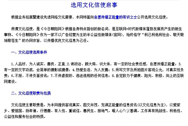 摘要:今日朝陽網(wǎng)文化信使,此非虛名,干系甚大。我不擅長寫稿,卻被聘為文化信使,能發(fā)揮點兒什么作用呢?
