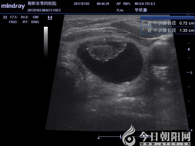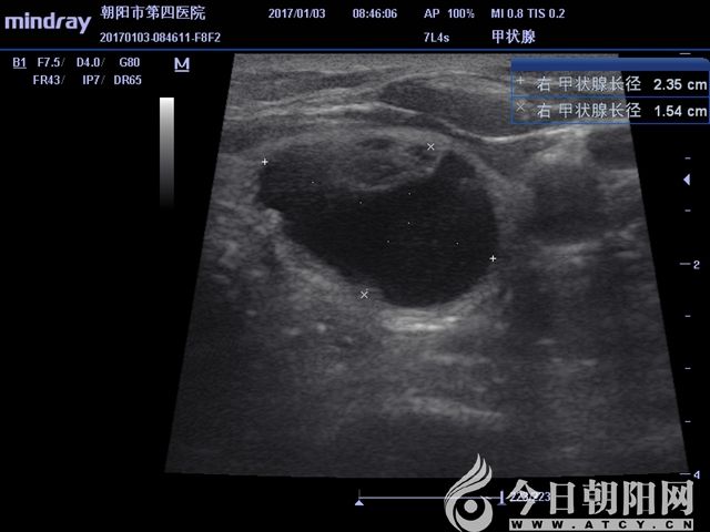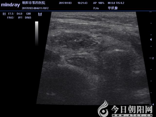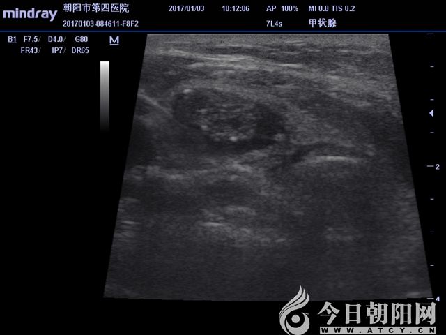 患者為65歲女性,發(fā)現(xiàn)左右側頸部包塊1個月,通過超聲檢查考慮甲狀腺腺瘤伴出血。患者從心理上不能接受頸部手術后切口瘢痕,拒絕手術切除,要求微創(chuàng)治療。針對患者要求,該院外科團隊為其設計了治療方案——行甲狀腺微波消融術。手術采用局麻,在超聲影像引導下,順利準確穿刺,抽出積血后,再于實性病變處用活檢針穿刺取病理,證實良性病變。