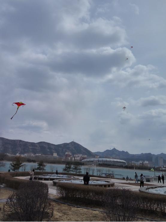 有老人帶著孩子祖孫一起放風(fēng)箏,爺爺手拿風(fēng)箏試著風(fēng)向,順風(fēng)一揚(yáng),風(fēng)箏飄飄悠悠的飛上了天,孫子跟在爺爺屁股后拽著線圈。有兩個小姑娘,站在大凌河岸邊,一只手舉風(fēng)箏試著風(fēng)向,邊試邊說:“這風(fēng)向也對啊,怎么就飛不起來呢?”小女孩再次把風(fēng)箏拋起,剛剛飛起一人多高,風(fēng)箏就又一頭栽了下來。路過的人建議她們到坡上去,以免風(fēng)箏墜入河里。
