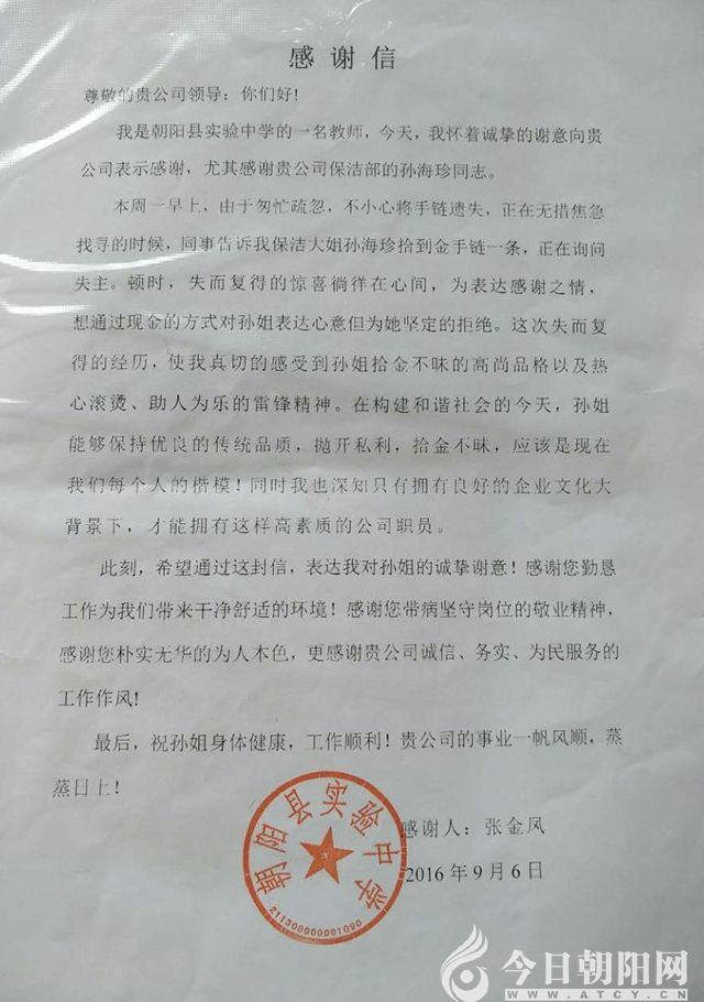 失主在感謝信中這樣寫道:“本周一早上,由于一時(shí)疏忽,不小心將金手鏈遺失。在我焦急找尋的時(shí)候,同事告訴我保潔大姐孫海珍拾到金手鏈一條,正在尋找失主。頓時(shí),失而復(fù)得的驚喜徜徉在心間,為表達(dá)感謝、感恩之情,我想通過現(xiàn)金的方式對孫姐表達(dá)心意,但被她堅(jiān)定地拒絕。心愛的手鏈?zhǔn)Ф鴱?fù)得的經(jīng)歷,使我真切地感受到孫姐拾金不昧的高尚品格以及熱心滾燙、助人為樂的雷鋒精神。在構(gòu)建和諧社會(huì)的今天,孫姐能夠保持優(yōu)良的傳統(tǒng)品質(zhì),拋開私利,拾金不昧,應(yīng)該成為我們每個(gè)人學(xué)習(xí)的楷模。此刻,希望通過這封信,表達(dá)對孫姐的誠摯謝意!感謝您勤懇工作為我們帶來干凈舒適的環(huán)境,感謝您帶病堅(jiān)守崗位的敬業(yè)精神,感謝您樸實(shí)無華的為人本色,更感謝貴公司誠信、務(wù)實(shí)、為人民服務(wù)的工作作風(fēng)。”