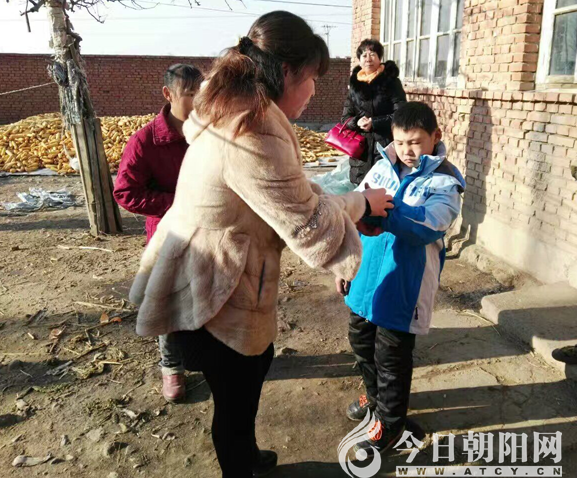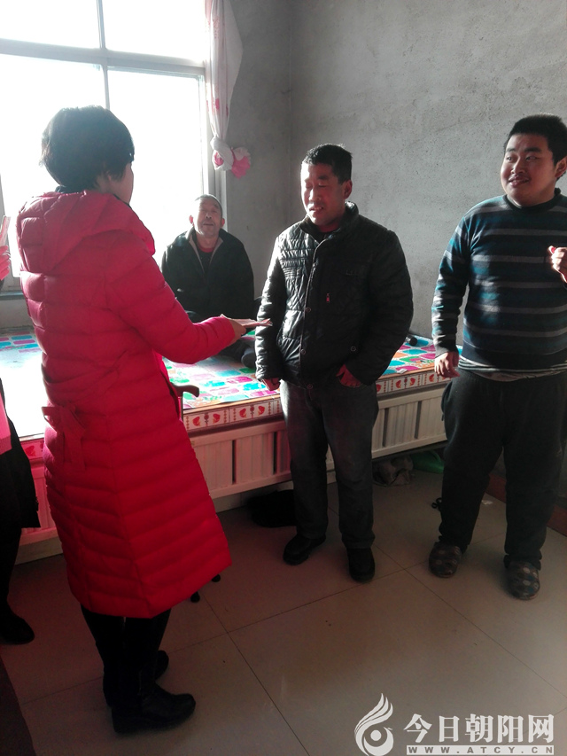 上午8點(diǎn)整,三個(gè)小組分頭行動(dòng)。第一黨小組走訪慰問的是家住楊樹灣河?xùn)|村的劉樹龍同學(xué)。孩子是我校聾班一年級(jí)學(xué)生,母親殘疾,哥哥自閉癥,一家四口僅靠孩子父親替別人看山維持生活。面對(duì)第一黨小組8名黨員,送去的新棉衣等御寒衣物和米、面、油、肉等物品,孩子父親激動(dòng)地說:“這下過年吃的、穿的都不用愁了。”隨同第一黨小組同行的還有孩子的班主任王愛華老師,她手上的袋子里裝的不僅僅是各樣食品,更是滿滿的愛。