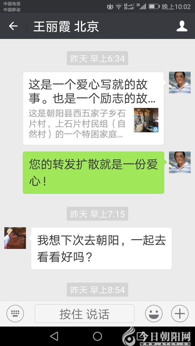 這是北京國土資源部的一位專家學(xué)者,一位好大姐看到微信后關(guān)心關(guān)注“小紅梅”,月底要來朝陽參加一個(gè)會議,還要去看“小紅梅”。