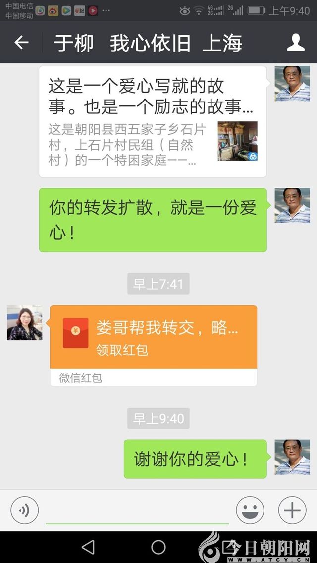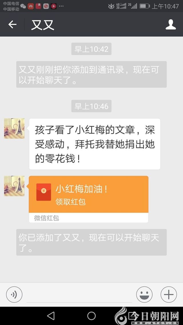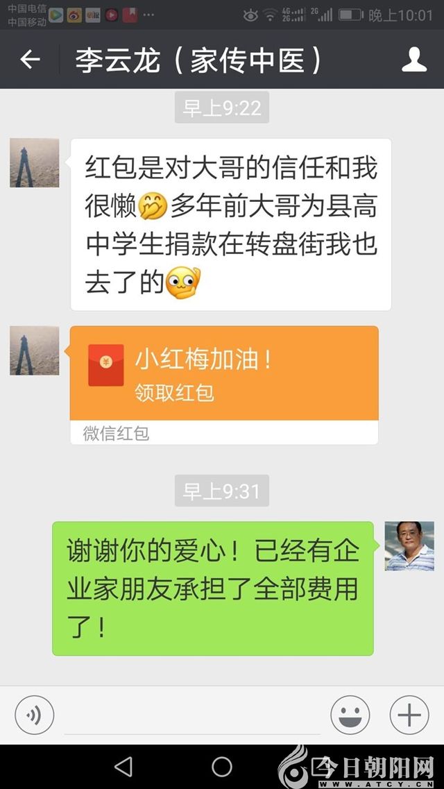 這是在上海廣電系統(tǒng)工作的朝陽人,關(guān)心家鄉(xiāng),關(guān)愛“小紅梅”。直接把愛心紅包發(fā)給了我!這里說明一下,所有個(gè)人發(fā)給我的紅包我都沒有點(diǎn)收,請朋友原諒我,理解我!我個(gè)人不想接觸一分錢!只想通過我們的努力,為“小紅梅”解決困難,避免出現(xiàn)問題和差錯(cuò),或者是誤會。我與田立梅都提前想到了這種情況,就都約好不點(diǎn)收,24小時(shí)自動退還了,請理解我們。再說了,去年頒布并實(shí)施的《慈善法》有相關(guān)規(guī)定,我們必須遵紀(jì)守法。