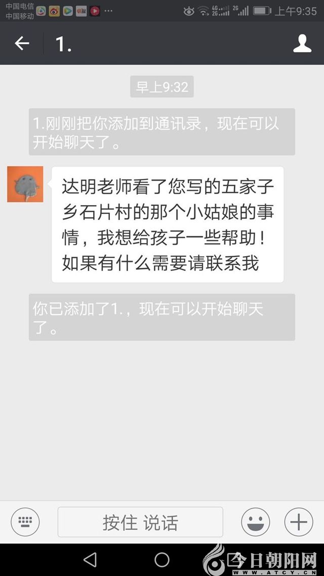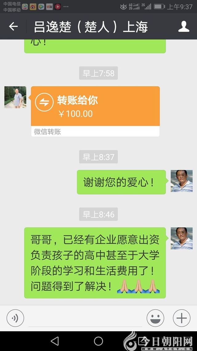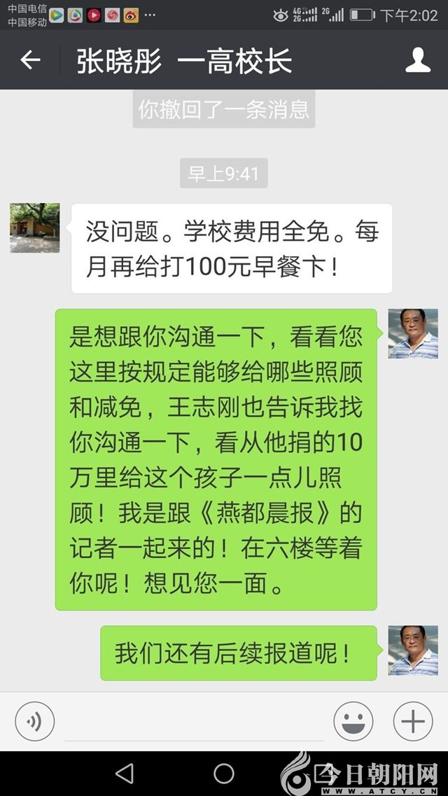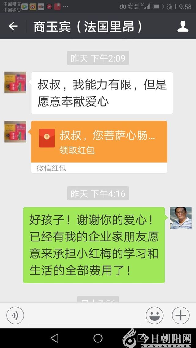 我的老朋友(認(rèn)識30多年了),朝陽傳奇文化旅游集團(tuán)董事長李海君通過微信喊話:我公司愿意負(fù)責(zé)承擔(dān)“小紅梅”的學(xué)習(xí)生活費(fèi)用。并且讓我去他公司面談,當(dāng)時(shí)是8點(diǎn)07分。
