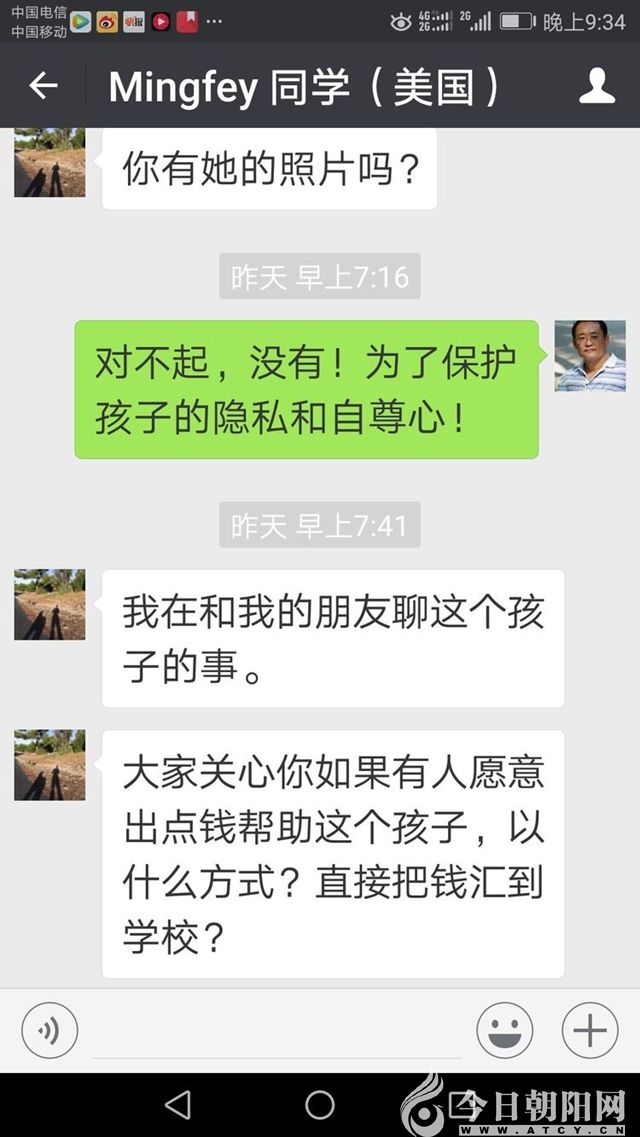 還有一段微信的內(nèi)容更讓我感動。這是一個(gè)20年前我個(gè)人救助過的孩子,這是多么懂事的孩子!她長大了,已經(jīng)做媽媽了。她在用自己的方式續(xù)寫著愛的故事。我在朋友圈里轉(zhuǎn)發(fā)這個(gè)截屏?xí)r這樣寫到:我相信愛能傳遞,愛能感染!我堅(jiān)信天空會更晴朗,陽光會更燦爛!我相信這愛會化作一種神奇的力量——創(chuàng)造奇跡!