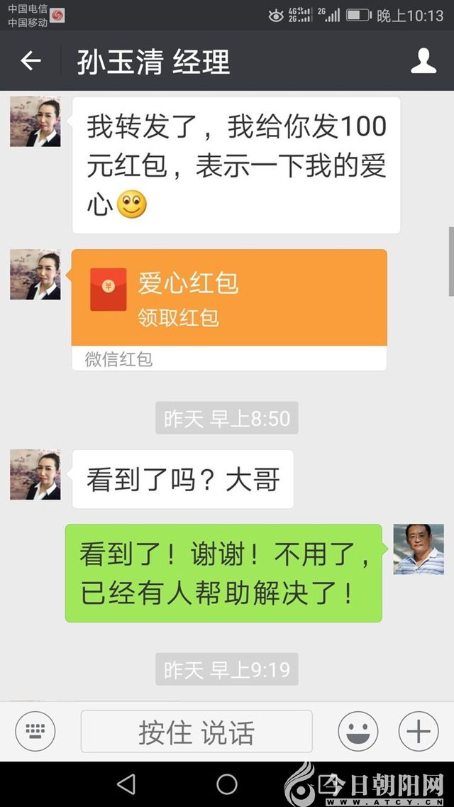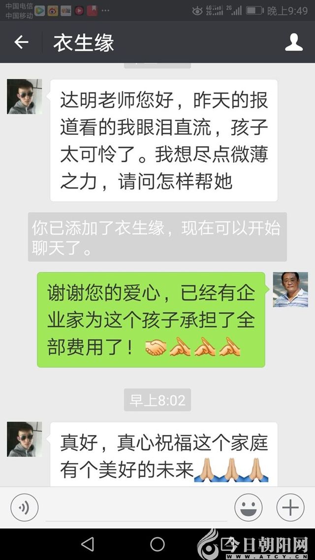 接著就接到朝陽知名的餐飲企業(yè)“小馬烤肉館”馬總的電話:大哥,那孩子有人幫助了嗎?沒人幫我?guī)?!?dāng)聽說有人幫助時(shí)他表示:我也幫幫這孩子,這樣吧,我每個(gè)月給孩子拿500元錢,不用見面,你讓孩子加我微信,我每個(gè)月轉(zhuǎn)給她就行?。ê髞砦野堰@些情況說給朋友和家人時(shí),他們都說,難怪人家都發(fā)財(cái),生意好!人家都有愛心,也都舍得奉獻(xiàn)啊?。?/span>