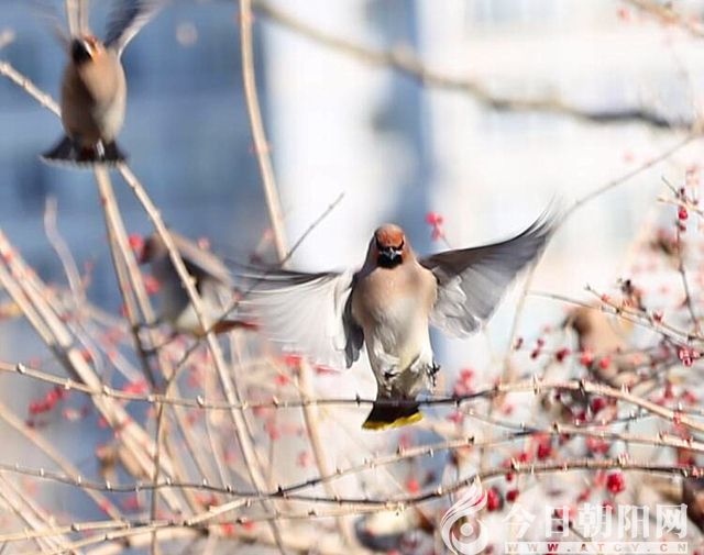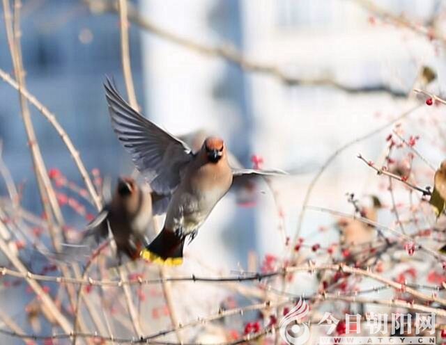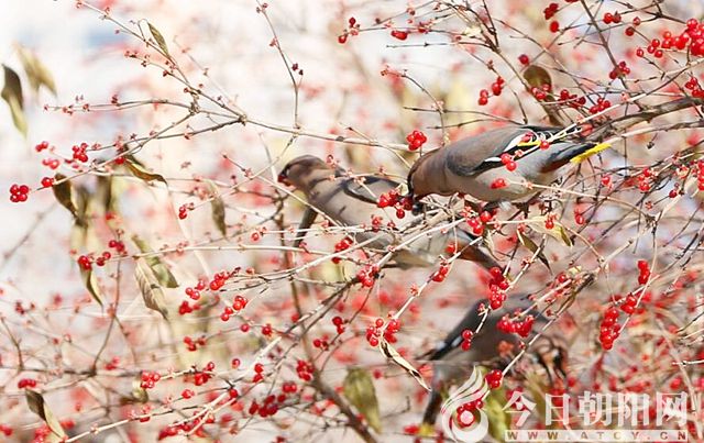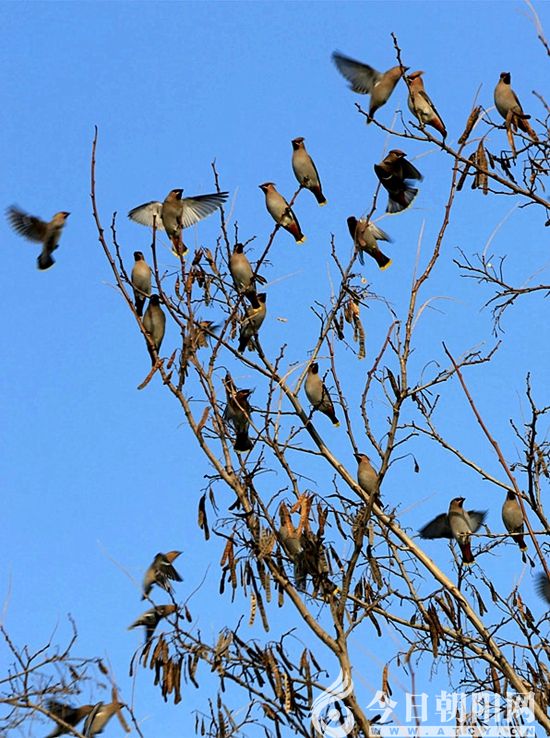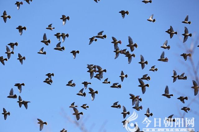 太平鳥非常好看。資料顯示,太平鳥為鳥綱太平鳥科。體長18厘米,翼展34-35厘米,體重40-64克,壽命通常超過5歲,屬小型鳴禽。太平鳥全身基本上呈葡萄灰褐色,頭部色深呈栗褐色,頭頂有一細(xì)長呈簇狀的羽冠,一條黑色貫眼紋從嘴基經(jīng)眼到后枕,位于羽冠兩側(cè),在栗褐色的頭部極為醒目。頦、喉黑色,翅具白色翼斑,次級(jí)飛羽羽干末端具紅色滴狀斑。尾具黑色次端斑和黃色端斑。特征極明顯,數(shù)量眾多,體態(tài)優(yōu)美,鳴聲清柔。分布于歐、亞各地。多數(shù)時(shí)候都是成群活動(dòng),有時(shí)甚至近百只,繁殖期它們就成對成雙地出行。這次來朝陽的太平鳥就有幾百只,鋪天蓋地,十分壯觀。太平鳥有大太平鳥和小太平鳥之分,黃尾巴的就是大太平鳥,紅尾巴的是小太平鳥,因?yàn)樗鼈兩盍?xí)性相同,所以經(jīng)常群居在一起活動(dòng)。那種把紅、黃尾巴作為區(qū)別雌雄的觀點(diǎn)顯然是誤區(qū)。