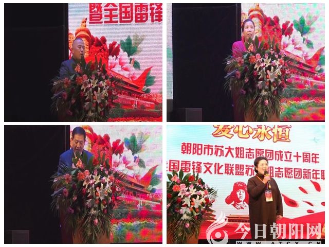 2017年12月23日上午9點(diǎn),伴著和諧美妙的音樂(lè),全國(guó)雷鋒文化聯(lián)盟蘇大姐愛(ài)心志愿團(tuán)成立十周年慶祝大會(huì)暨迎新年聯(lián)誼會(huì)正式開(kāi)始。全國(guó)雷鋒文化聯(lián)盟副理事長(zhǎng)姜愛(ài)軍,朝陽(yáng)市婦聯(lián)副主席陳淑高,市文明辦副主任王希龍,扮演毛澤東的特型演員李志江,以及省內(nèi)外部分學(xué)雷鋒模范參加了活動(dòng)。
