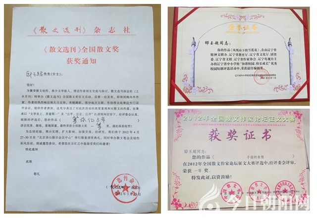 2013年5月,散文《綏中六記》獲得遼寧省作協(xié)和綏中縣主辦的全國征文大賽二等獎。