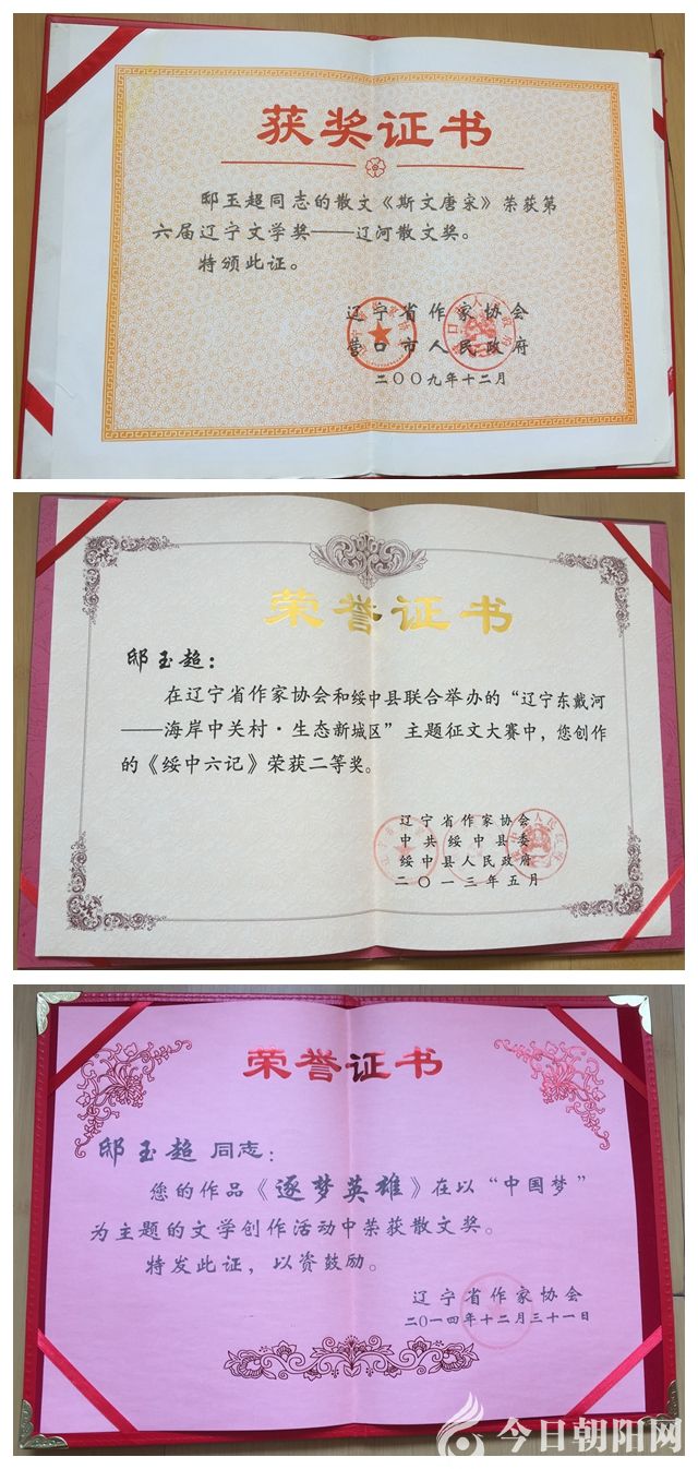 邸玉超是迄今為止,朝陽市唯一有作品入選中考語文試卷的作家;唯一被全國名刊《小說月報》《讀者》轉(zhuǎn)載作品的作家,唯一在全國名刊《散文》發(fā)表兩組作品的作家;唯一入選國標教材·語文教師教學用書的作家;唯一被20多家圖書館自購館藏著作的作家;唯一有作品入選《新中國散文典藏》的作家。