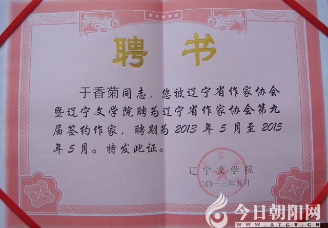 由于于香菊創(chuàng)作成績(jī)突出,2011年入選中國(guó)作家協(xié)會(huì)會(huì)員;2013年5月,被遼寧省作協(xié)暨遼寧文學(xué)院聘為第九屆遼寧省作協(xié)簽約作家;2013年,作品《青萍》榮獲第八屆遼寧文學(xué)獎(jiǎng)——中篇小說(shuō)獎(jiǎng)。為響應(yīng)總書(shū)記的講話精神,于香菊認(rèn)真落實(shí)“積極深入生活,為人民寫(xiě),寫(xiě)人民”的創(chuàng)作要求;2015年,被遼寧省作協(xié)派駐朝陽(yáng)縣黑牛營(yíng)子鄉(xiāng),成為定點(diǎn)深入生活的作家。在深刻體驗(yàn)家鄉(xiāng)人民的生活過(guò)程中,于香菊積累了豐厚的寫(xiě)作素材,并初步完成了許多以“凌水灣”為題材的文學(xué)作品,如《嘗試贊美這殘缺的世界》《秦棗女》《遼繡雙姝》《定點(diǎn)生活錄》《寫(xiě)戲記》等中篇小說(shuō)。