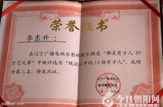 突然有一天,李東升接到了遼寧衛(wèi)視打來的電話,說他參賽的節(jié)目入選了。按照遼寧衛(wèi)視的活動要求,要在報(bào)名的3000多組中通過比賽淘汰的方式選出30組,然后從30組中再選出10組,最后再爭奪前10強(qiáng)。經(jīng)過一番激烈角逐,最后,李東升以超常的發(fā)揮獲得了前三名的比賽成績。除了獲獎證書外,還得了一臺數(shù)碼攝像機(jī)。