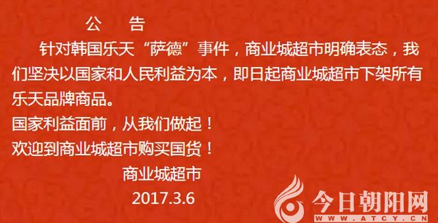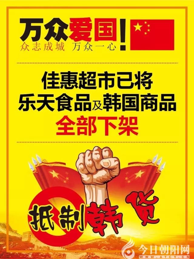 “心事浩茫連廣宇,于無(wú)聲處聽驚雷”。近日,朝陽(yáng)新瑪特、朝陽(yáng)佳惠超市、朝陽(yáng)商業(yè)城超市連夜下架韓國(guó)商品的消息傳來(lái),令人心潮起伏,感慨萬(wàn)千。我為朝陽(yáng)有這樣的良心企業(yè)點(diǎn)贊,為這樣的民族血性高歌。