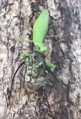 “螳螂捕蟬,黃雀在后”出自《莊子·山木》。諷刺了那些只顧眼前利益,不顧身后禍患的人;對鼠目寸光、利令智昏、不顧后患的這類人提出警告。真實版的螳螂捕蟬,你見過嗎?該視頻呈現(xiàn)出一幅螳螂捕蟬的真實畫面,另作打油詩一首,如下: