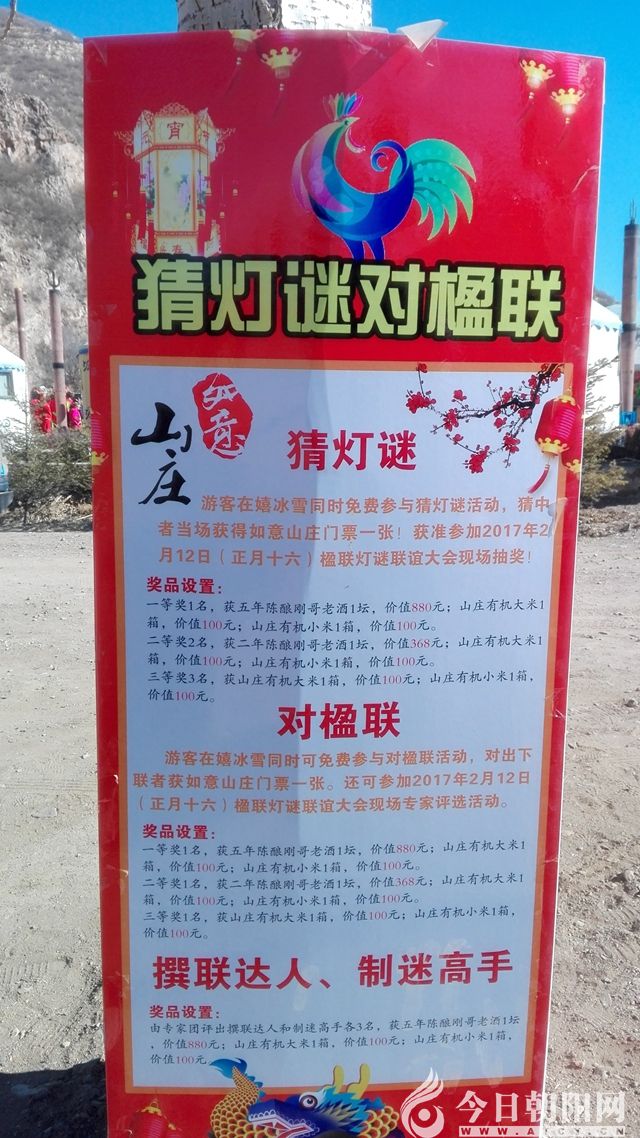 如意山莊位于輻輳阜新、錦州的北票市馬友營(yíng)鄉(xiāng),以地方名勝泉涌山為依托,山水相依,植被豐茂,風(fēng)景殊勝,新近被晉升為國(guó)家三A景區(qū)。這里文藝活動(dòng)頻繁,不僅擁有自己的演出團(tuán)體,還廣邀名家,登臺(tái)亮相。2017年1月20日,朝陽(yáng)市文聯(lián)就組織楹聯(lián)書法家蒞臨山莊,為當(dāng)?shù)匕傩諘鴮懘郝?lián),并與當(dāng)?shù)鼐蠢显旱睦先藗円黄鸲冗^(guò)傳統(tǒng)的小年。此次由三市文聯(lián)聯(lián)合主辦的楹聯(lián)燈謎聯(lián)誼大會(huì),為這里傳統(tǒng)的元宵節(jié)再添新的文化色彩。