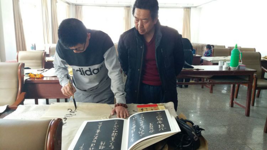 書法研究生、副主席閆志遠(yuǎn)(左)在臨帖過程中積極與書友們交流心得,研討筆法。