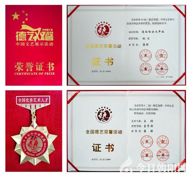 多年來,崔穎以出色的音樂才華,曾獲得“遼西空調(diào)杯”朝陽電視歌手大賽三等獎;朝陽市“銀龍杯”電視歌手大賽二等獎;朝陽市“華運杯”電視通俗唱法歌手大賽唯一金獎;曾代表朝陽市參加遼寧電視臺歌手大賽獲優(yōu)秀歌手獎;2007年,在北票舉辦“崔穎個人演唱會”,在該市首開先河;2011年,拍攝北票音樂人創(chuàng)作歌曲MV《為北票喝彩》;2016年,在朝陽市凌河之夏“壯美凌河”歌手大賽中獲得一等獎;在第12屆《德藝雙馨》中國文藝展示活動全國總決賽中,獲得通俗唱法成年組銀獎,并獲全國“優(yōu)秀藝術(shù)指導(dǎo)教師”稱號,獲得組委會頒發(fā)的《德藝雙馨全國優(yōu)秀藝術(shù)人才》獎?wù)隆?/span>