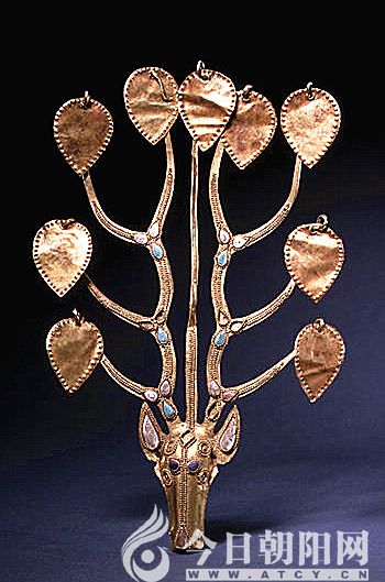 此類(lèi)步搖冠或步搖的發(fā)現(xiàn),不僅見(jiàn)于黃金之丘的一例,往西,1864年頓河下游的新切爾卡斯克薩爾馬泰女王墓亦有出土,年代為公元前2世紀(jì)。冠正面的金樹(shù)兩旁對(duì)立二鹿,側(cè)面金樹(shù)兩旁各有一只面向前方的盤(pán)角羊,后面還跟著兩只禽鳥(niǎo),這一部分帶有濃厚的薩爾馬泰藝術(shù)風(fēng)格,但冠體裝飾則大異其趣,那里鑲嵌有紫水晶、珍珠以及柘榴石雕琢的女神像,呈現(xiàn)出希臘藝術(shù)的特色。