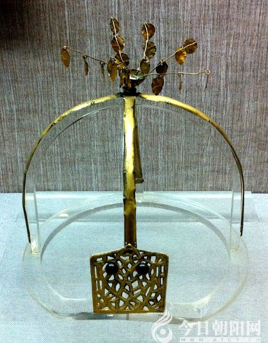 在地處遼寧北票西官營(yíng)子的北燕“二當(dāng)家”馮素弗的墓中,出土的金步搖冠高約26厘米、額飾長(zhǎng)7.1厘米、寬6.4-6.9厘米。此冠是在籠冠的梁架上,即冠頂出一枝步搖花,由籠冠和花樹(shù)頂兩部分構(gòu)成。頂花六枝鉚接在一個(gè)仰缽形座上,每枝綴金葉片,搖動(dòng)即響。梁架處列金片十字形,片條上有兩兩相對(duì)的針孔,當(dāng)作綴冠之用;額飾狀如山形,正面以細(xì)金絲和致密的金粟顆粒貼焊成變形蟬紋圖案及邊框,空地處鏤空,中上部嵌兩枚灰石珠作蟬目。這是一件完整的步搖冠實(shí)物,彌足珍貴,現(xiàn)藏于遼寧省博物館。