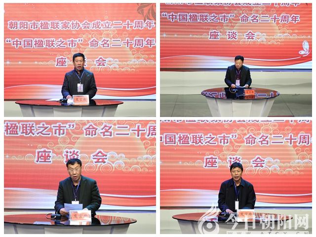 12月10日,遼寧省朝陽市楹聯(lián)家協(xié)會(huì)成立暨“中國楹聯(lián)之市”命名二十周年座談會(huì)在朝陽文化大廈召開。遼寧省楹聯(lián)家協(xié)會(huì)主席宮寶安,遼寧省楹聯(lián)家協(xié)會(huì)常務(wù)副主席、大連市楹聯(lián)家協(xié)會(huì)主席王新波,大連市楹聯(lián)家協(xié)會(huì)副主席兼秘書長郭占義,中共朝陽市委宣傳部副部長劉利民,朝陽市文聯(lián)主席王文書、副主席李志俊,朝陽市楹聯(lián)家協(xié)會(huì)顧問管文華等到會(huì)祝賀。來自全市楹聯(lián)家代表百余人參加會(huì)議,會(huì)議由朝陽市文聯(lián)副主席劉乃俠主持。