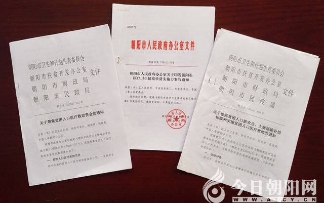 朝陽(yáng)市規(guī)定將貧困人口新農(nóng)合住院報(bào)銷(xiāo)比例提高10個(gè)百分點(diǎn),將大病保險(xiǎn)起付線(xiàn)降低5000元,報(bào)銷(xiāo)比例提高20個(gè)百分點(diǎn)。圖為我市出臺(tái)的貧困人口醫(yī)療救助政策文件。