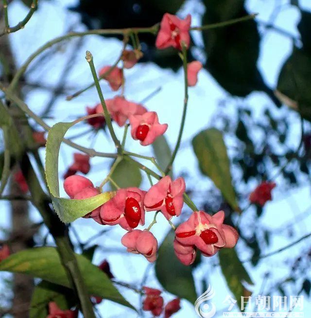 差點(diǎn)忘了,有一種樹叫絲棉木,是園林引進(jìn)的觀賞樹。其中一種叫桃葉衛(wèi)矛,籽實(shí)美極了。實(shí)在地說(shuō)這樹的葉兒精氣神比不上本地的楊樹柳樹,可它的果,很像四角的小燈籠。灰黃色,等映出棕褐色時(shí),種皮裂開,晶亮的籽兒,紅得奪目。細(xì)看,聯(lián)想到老蚌含珠;遠(yuǎn)望,疑似秋天紅葉更像異域奇花。