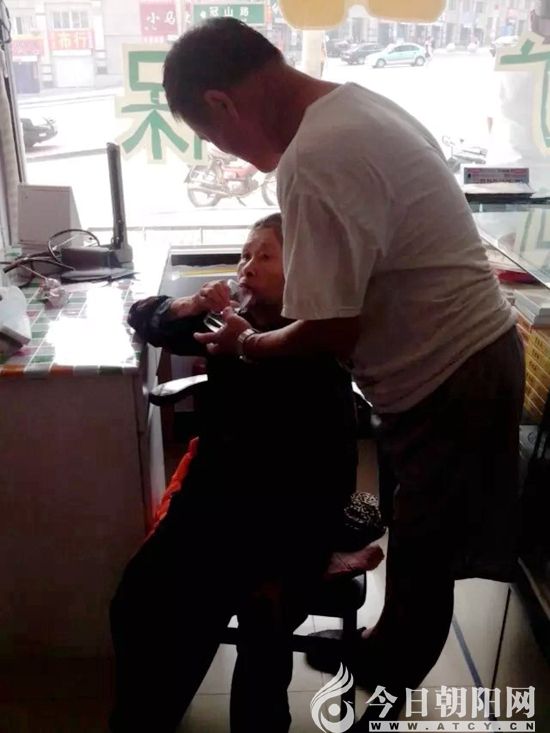 護士給老太太打完針,兒子將母親抱到旁邊的椅子上坐好,準備把那喝的藥先喝兩粒。我用手機拍下這溫馨的畫面。