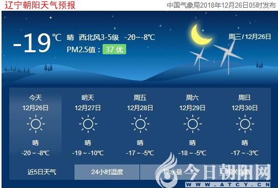 今天是2018年12月26日,星期三,農(nóng)歷十一月二十。遼寧朝陽晴,氣溫-20~-8℃,西北風(fēng)3~5級,空氣質(zhì)量優(yōu)。日出時間:07:23;日落時間:16:33。