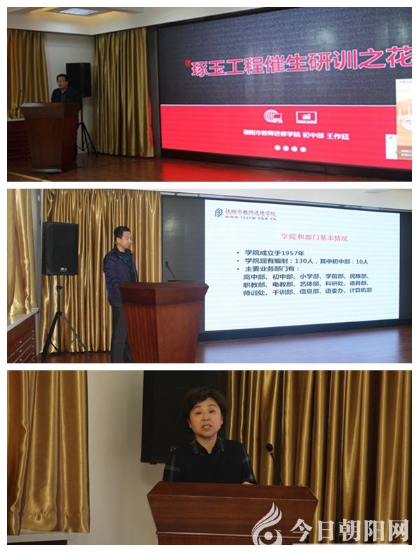 朝陽市教師進修學院初中部主任王作廷作了題為《琢玉工程催生研訓之花》的工作匯報,他從朝陽市初中的實際情況,到建立研訓基地和開展局直初中青年教師素質提升研訓系列活動這兩項創(chuàng)新工作的指導思想、目標、內容、具體活動安排都作了詳實的闡述。