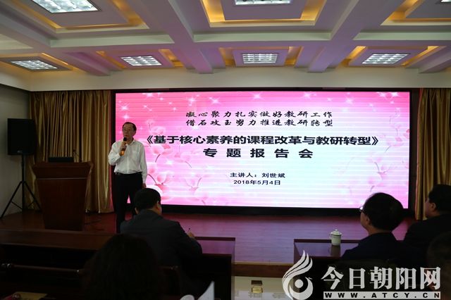 伴隨著基礎(chǔ)教育課程改革的不斷深入,面對基礎(chǔ)教育發(fā)展的新形勢和新任務(wù),為了積極推動教研工作轉(zhuǎn)型,2018年5月4日,市教師進(jìn)修學(xué)院針對教研員在教研轉(zhuǎn)型過程中存在的實際困惑,組織了以“凝心聚力扎實做好教研工作,借石攻玉努力推進(jìn)教研轉(zhuǎn)型”為主題的專題報告會,邀請大連教育學(xué)院初中教師教育中心主任劉世斌就“基于核心素養(yǎng)的課程改革與教研轉(zhuǎn)型”到朝陽進(jìn)行專題培訓(xùn)。朝陽市教師進(jìn)修學(xué)院、部分縣市區(qū)教師進(jìn)修學(xué)校的負(fù)責(zé)人和研訓(xùn)員,共100多人參加了報告會。報告會由市教師進(jìn)修學(xué)院副院長佟英峰主持。
