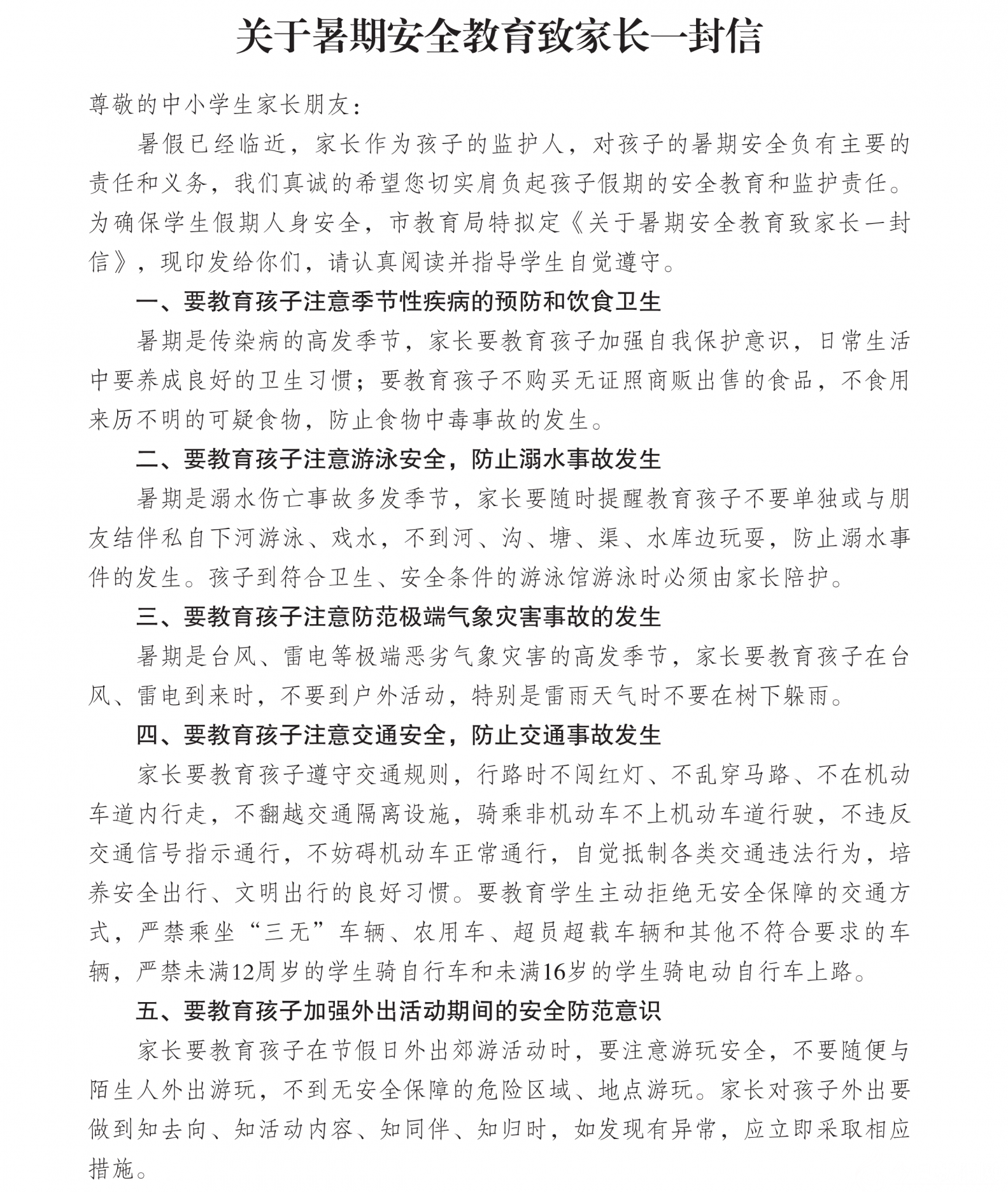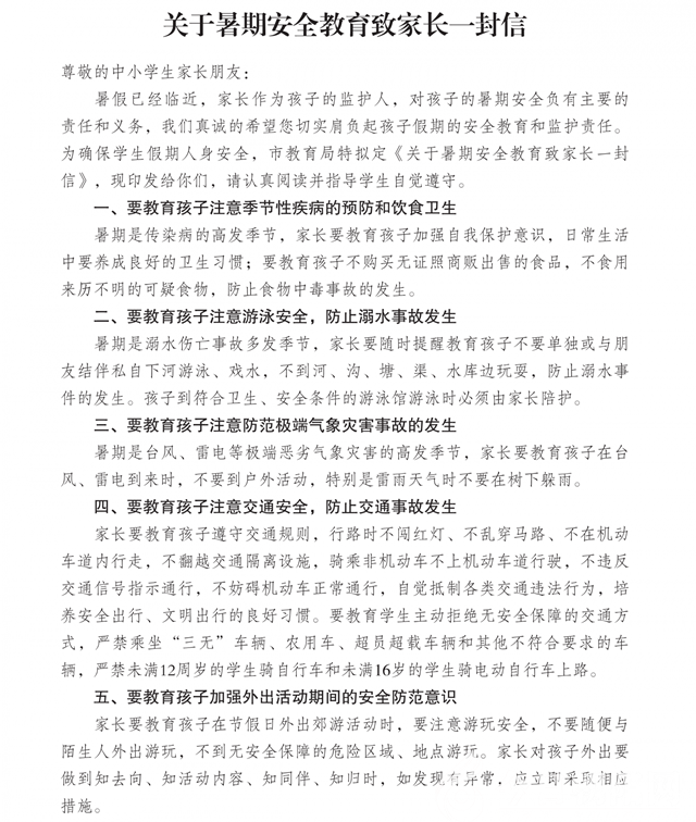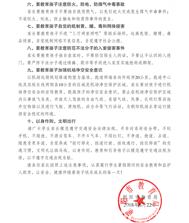摘要:@家長(zhǎng) 關(guān)于暑假安全教育,朝陽市教育局給您寫了一封信! @家長(zhǎng) 關(guān)于暑假安全教育,朝陽市教育局給您寫了一封信! (點(diǎn)擊圖片可查看高清大圖) 來源:朝陽市教育局(體育局)網(wǎng)站 [責(zé)任編輯 趙盼] 好名聲網(wǎng) 【本網(wǎng)聲明】