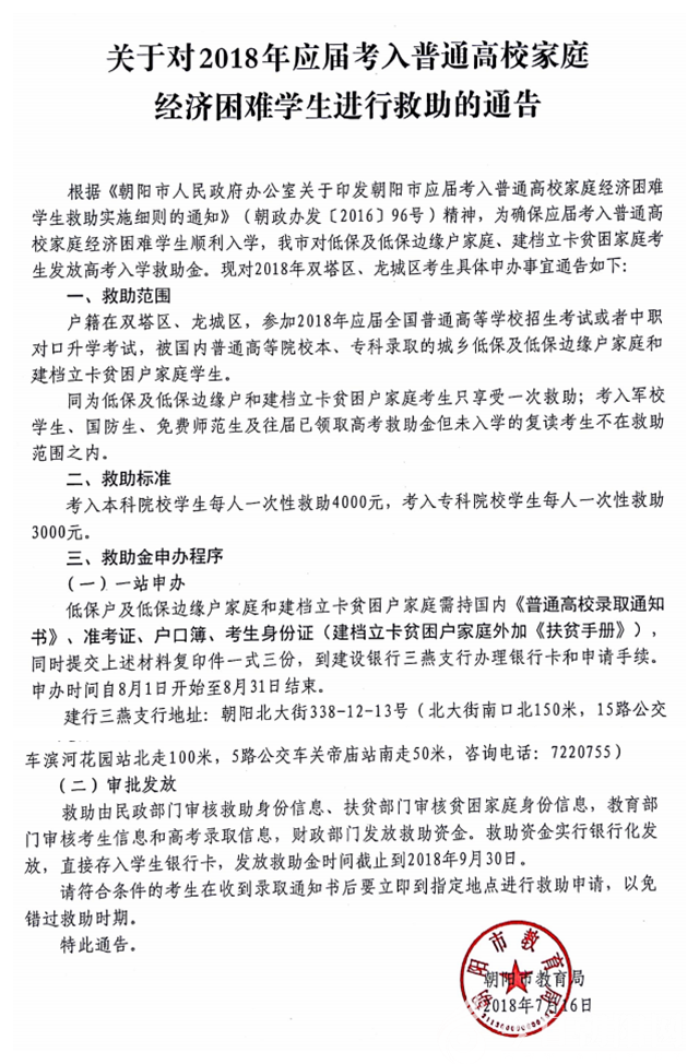 請(qǐng)注意,本《通告》中明確的救助范圍包括:“戶籍在朝陽(yáng)市雙塔區(qū)、龍城區(qū),參加2018年應(yīng)屆全國(guó)普通高等學(xué)校招生考試或者中職對(duì)口升學(xué)考試,被國(guó)內(nèi)普通高等院校本、??其浫〉某青l(xiāng)低保及低保邊緣戶家庭和建檔立卡貧困戶家庭學(xué)生。”