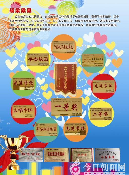 總之,經(jīng)全校師生的共同努力,學(xué)校各項工作取得了較好的成績,榮獲遼寧省寫字特色學(xué)校、遼寧省綠色學(xué)校、遼寧省文明學(xué)校、朝陽市五星級學(xué)校、朝陽市文明單位、朝陽市先進(jìn)職工之家、朝陽市優(yōu)秀大課間班班有歌聲先進(jìn)學(xué)校、雙塔區(qū)行為規(guī)范先進(jìn)學(xué)校、雙塔區(qū)教育工作教育工作先進(jìn)單位等榮譽。