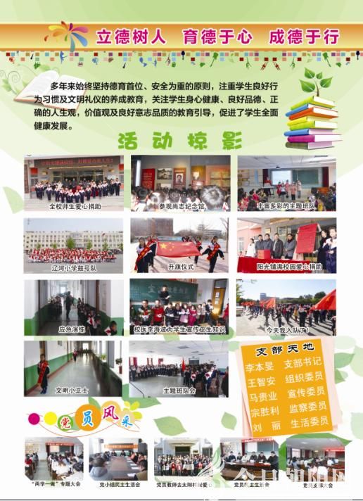 學(xué)校積極開展升旗儀式、愛心捐助、參觀烈士紀(jì)念館、衛(wèi)生講座,主題班會,文化娛樂等各項活動。在教學(xué)中要求學(xué)生讀好書、寫好字、做好操、唱好歌、掃好地,促進(jìn)習(xí)慣養(yǎng)成和滲透,從而達(dá)到育德于心,成德于行。