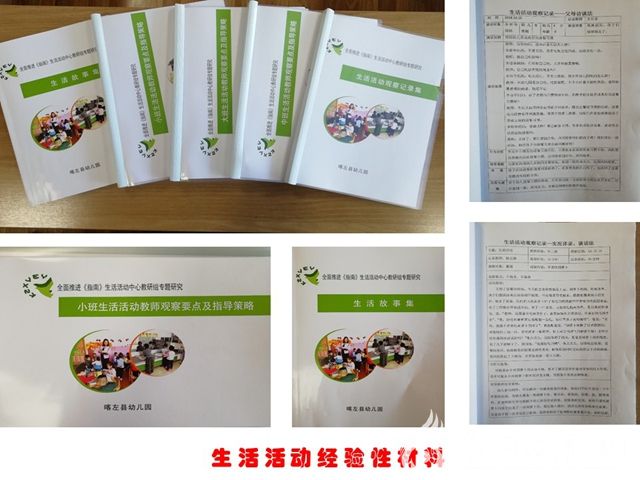 喀左縣幼兒園非常注重經(jīng)驗材料的整理與梳理。隨著實驗工作的開展,陸續(xù)整理形成了《小、中、大班生活活動教師觀察要點及指導策略》,將可以觀察到的行為作為觀察的指標,教師們在活動中充分觀察,尋找解決措施。經(jīng)過實踐,此表內(nèi)容具體、指向清晰、記錄簡便,教師用起來得心應手。同時幼兒園還整理出了《生活活動觀察記錄集》《生活活動案例集》以及《生活故事集》并整理成冊。