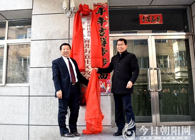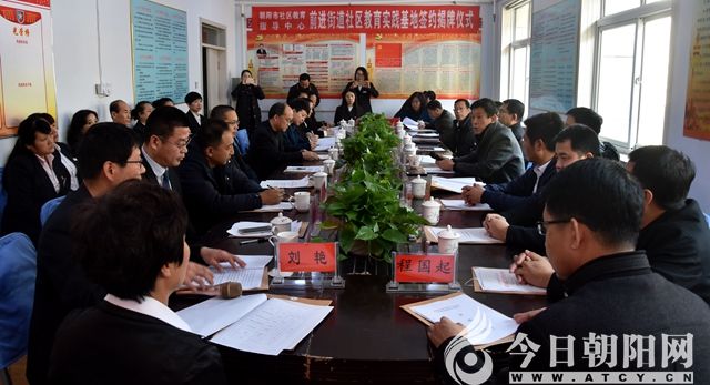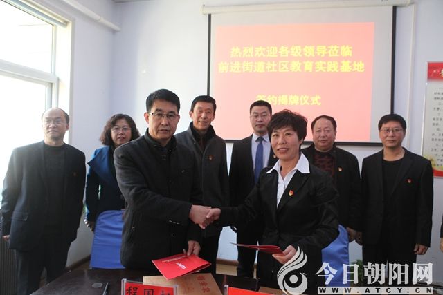 簽約儀式結(jié)束后,朝陽市教育局副局長李鵬宇、雙塔區(qū)政府副區(qū)長張立共同為“前進(jìn)街道社區(qū)教育實踐基地”揭牌。