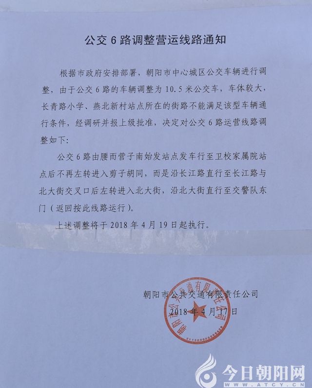 根據(jù)市政府安排部署,朝陽市中心城區(qū)公交車輛進行調(diào)整,由于公交5路、6路的車輛調(diào)整為10.5米,車體較大,長青路小學(xué)、燕北新村站點所在的街路不能滿足該型車輛通行條件,經(jīng)調(diào)研并報上級批準(zhǔn),決定對公交5路、6路運營線路調(diào)整如下: