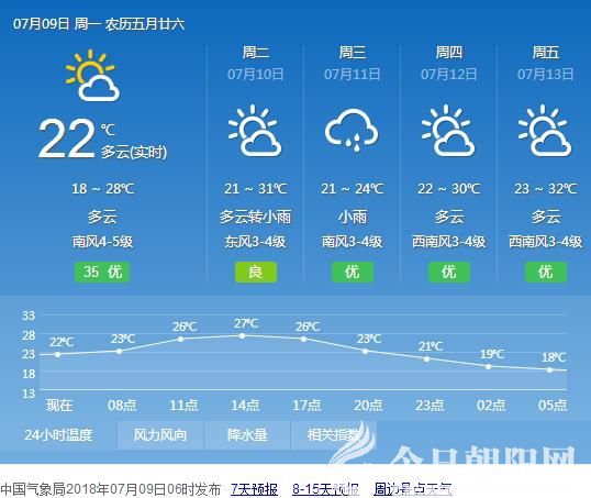 下過(guò)解暑雨,這兩天感覺(jué)涼爽多了。不被悶熱困擾,網(wǎng)友們的這個(gè)周末是不是過(guò)得很舒暢呢?今天星期一,又是滿血復(fù)活的日子,來(lái)看一下今天遼寧朝陽(yáng)的天氣預(yù)報(bào)吧!7月9日,日出時(shí)間為上午4點(diǎn)32分,日落時(shí)間為下午7點(diǎn)37分。氣溫18~28℃,多云,南風(fēng)4~5級(jí)。