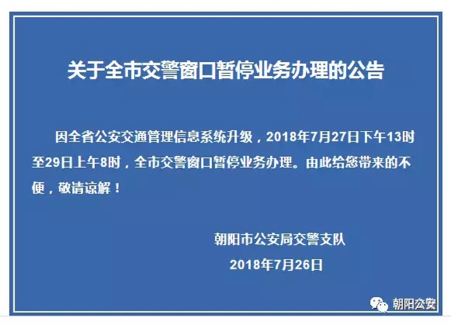 提醒廣大市民:截至明日8時,朝陽市交警窗口暫停業(yè)務辦理