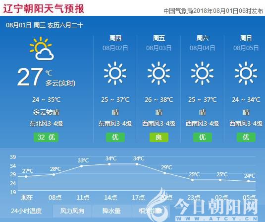 八一建軍節(jié)到了,遼寧朝陽以35℃的高溫迎接這個光榮的日子。今天(8月1日)多云轉(zhuǎn)晴,氣溫24~35℃,東北風(fēng)3~5級。