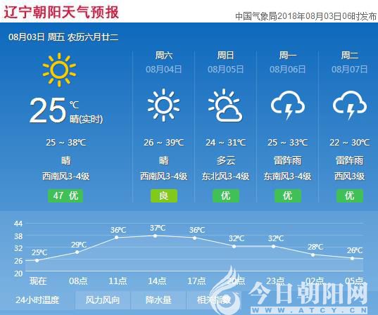 摘要:高溫“桑拿天”席卷全國,炎夏“烤箱模式”在各地陸續(xù)開啟。遼寧朝陽今天(8月3日)晴,氣溫25~38℃,西南風3~4級。明天依舊晴空萬里,最高氣溫達到38℃,大家一定要注意防暑。