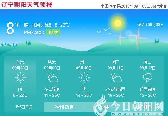 今晨小編醒得很早,不是被鬧鐘吵醒的,也不是被夢(mèng)想叫醒的,而是讓窗縫里擠進(jìn)來的冷風(fēng)生生凍醒的。趕緊調(diào)整睡姿、扯過棉被、抓起手機(jī)查看天氣,果然,氣溫又下降了。預(yù)報(bào)顯示,今天(9月8日),遼寧朝陽晴轉(zhuǎn)多云,最低溫度為8℃,最高溫度22℃,還有3~5級(jí)的北風(fēng)。不過還好,到了明天北風(fēng)會(huì)變?yōu)槟巷L(fēng),氣溫也會(huì)小幅上升。