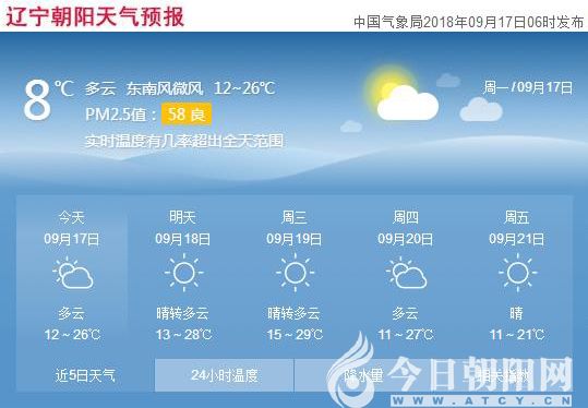 摘要:新的一周開始了,經(jīng)過周末兩天的低溫大風(fēng),今天會(huì)是怎樣的天氣呢?9月17日,遼寧朝陽多云,最低溫度12℃,最高溫度26℃,東南風(fēng)微風(fēng)。