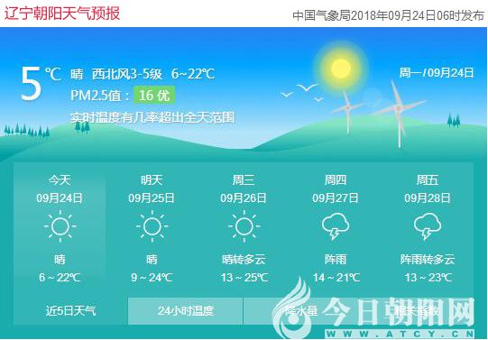 網(wǎng)友們,早上好!中秋節(jié)到了,是不是特別關(guān)心今兒個(gè)的天氣呢?小編要告訴大家一個(gè)好消息,今天(9月24日),遼寧朝陽(yáng)晴空萬(wàn)里,氣溫在6~22℃之間,雖然會(huì)有3~5級(jí)的西北風(fēng),但整體來(lái)說(shuō)天氣還是不錯(cuò)的,不會(huì)耽誤中秋賞月。