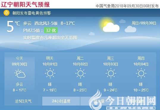 摘要:新一輪冷空氣的造訪,讓遼寧朝陽最低氣溫降到個位數(shù),最高氣溫也跌至20℃以下。今天(9月30日),會以多云天氣為主,氣溫在8~17℃之間,西北風(fēng)3~5級。天氣轉(zhuǎn)涼,網(wǎng)友們一定注意保暖,小心感冒。