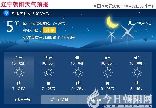 早上好!親愛的網(wǎng)友們,為您報(bào)天氣的同時小編正瑟瑟發(fā)抖與寒冷做斗爭。今天(10月2日),遼寧朝陽晴,氣溫7~24℃,雖然風(fēng)力不是很大,但一大清早空氣中流動的絲絲冷氣真的很有穿透力,提醒早起出門的網(wǎng)友一定記得加衣!