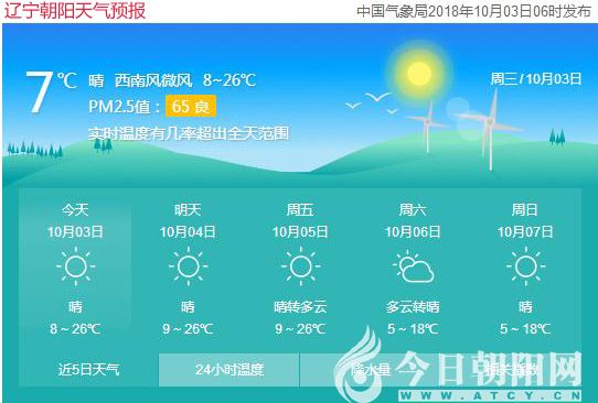 國慶長假已經過去兩天,相信出游的您已經在想去的地方了。無論您在哪兒都來關心一下遼寧朝陽的天氣吧!今天(10月3日),天氣晴好,氣溫也升高了幾度,最低溫度8℃,最高溫度達到26℃。和前兩天不同的是,今天風向轉為西南風,且只是微風。